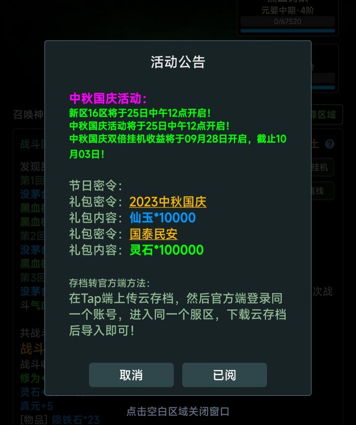 中秋国庆礼包来啦!!【礼包】密令1:2023中秋国庆礼包:仙玉×10000密令2:国泰民安礼包:灵石×100000【活动】1.挂机双倍收益活动将于2023/09/28日中午12点开启,截止2023/10/03中午12点!2.节日活跃度活动将于2023/09/25中午12点开启,截止2023/10/25中午12点!#荒古修仙传 #礼包 #节日 #国庆 #中秋