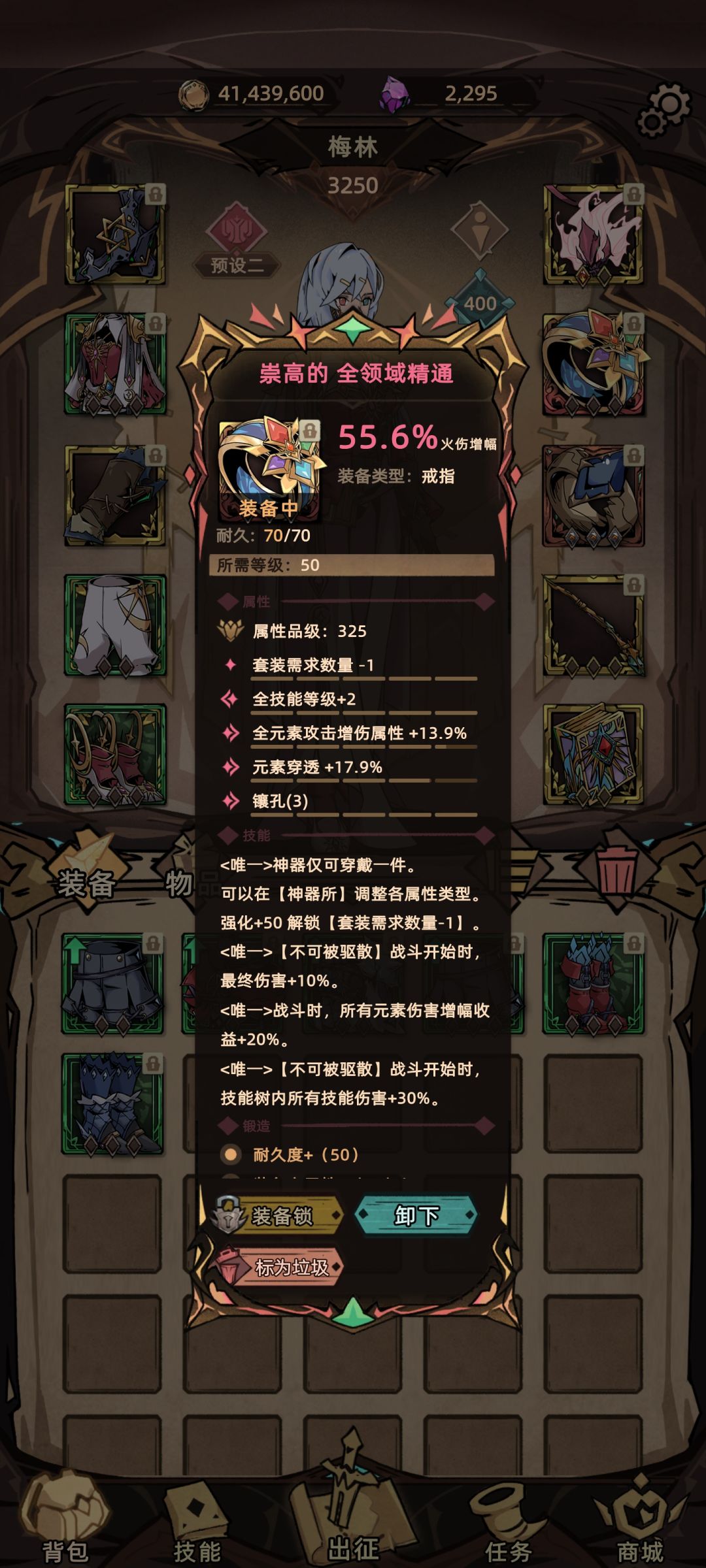 装备点评:两个神器戒指各有各的优点 毁灭莲华能够快速的叠buff清空 并且-CD 全领域精通有大量元素增伤与技能增伤 (我魔法师未做出毁灭莲华 暂时用圣使的代替 注意神器主属性都要选择火属性)