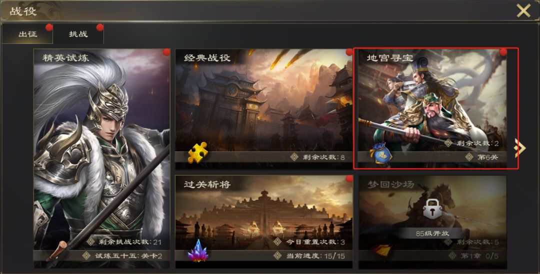 本期给大家带来的是热血三国无双里战役界面的地宫寻宝玩法,玩家在主界面点击战役按钮即可进入地宫寻宝玩法界面