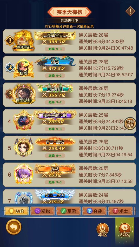 先锋-赛季天梯榜:【9-3 灬義薄雲天灬】388亿战力 通关28层用时 6分34秒