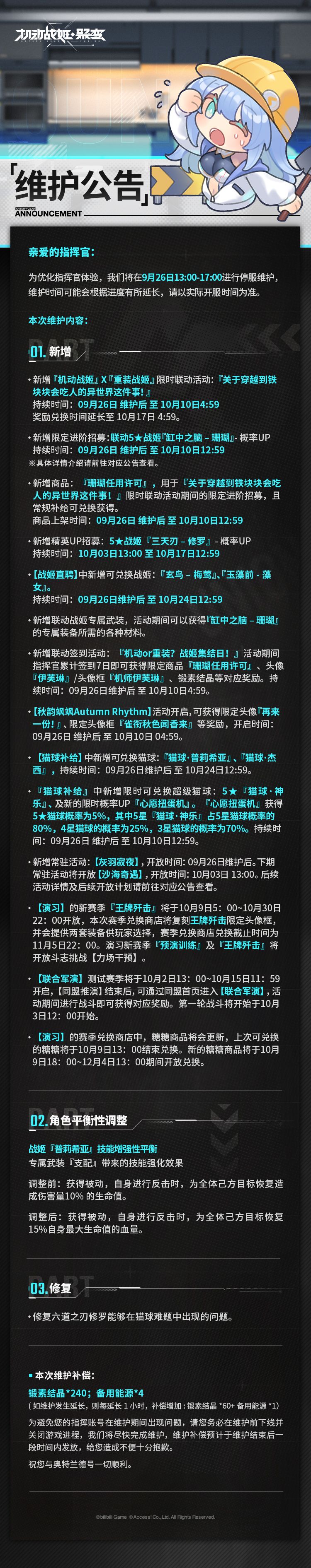 整修完成后我们会为您提供相应补偿物资【锻素结晶*240+备用能源*4】