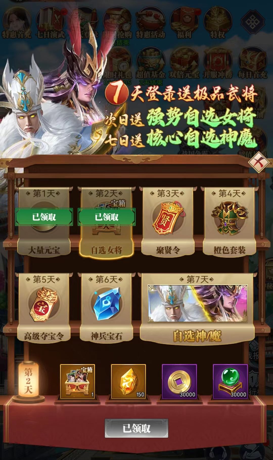 每日登录均可领取丰富福利,元宝、聚贤令、高级夺宝令、三国核心女将、神兵宝石、修罗套装……每日惊喜福利送不停!第七天登录,还可获得神魔核心武将哦~