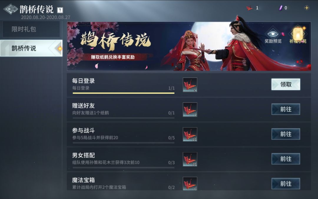 完成每天所有活动任务可获得59只纸鹤,任务每天0点刷新,在活动期间,猎手们满打满算可获得413只纸鹤!两套七夕浪漫时装马上到手,剩余的纸鹤还能兑换其他小物件~