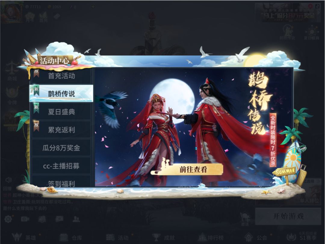 8月20日0点——8月27日24点,鹊桥传说浪漫开启,为了让各位猎手可以在战场上找到自己心仪的对象,鹊桥开启的时间可是有整整一周哦!届时猎手可以在活动中心的鹊桥传说独立窗口进入,也可以通过游戏主页面右上角的活动图标进入。各位猎手记得打开游戏参与活动哟!