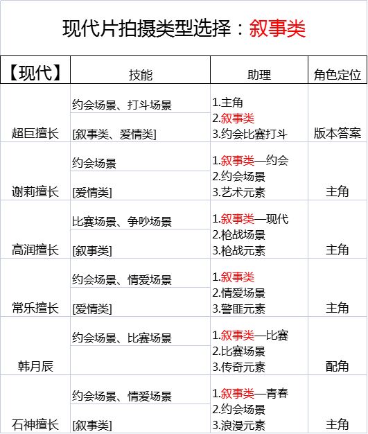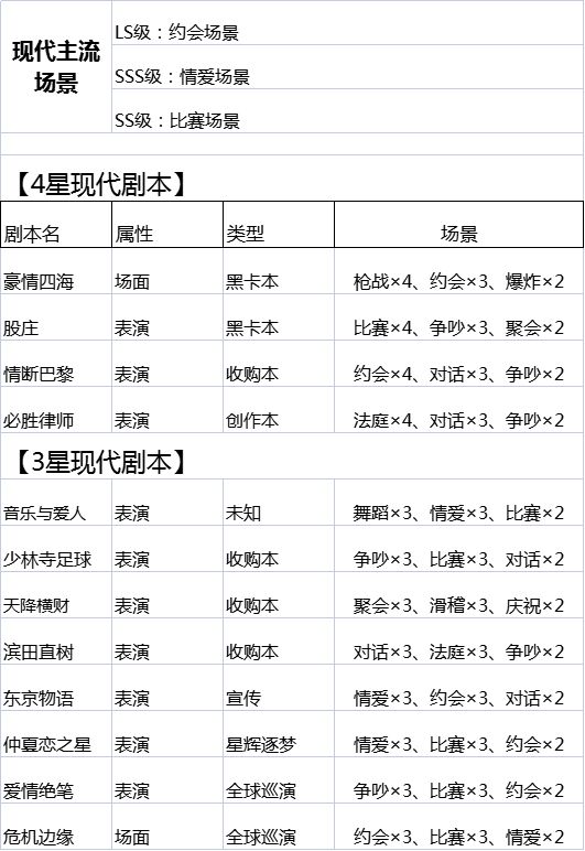 二.现代巨星定位、现代场景优先级、现代剧本场景概况