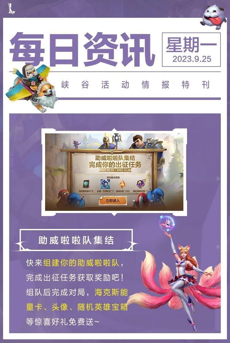 星之守护者 阿狸 永绽盛芒将于9月28日0点上线战利品系统。在迎接星之守护者小队到来时,召唤师不妨先“集结自己的小队”,现在集结属于自己的小队还有额外好礼赠送!