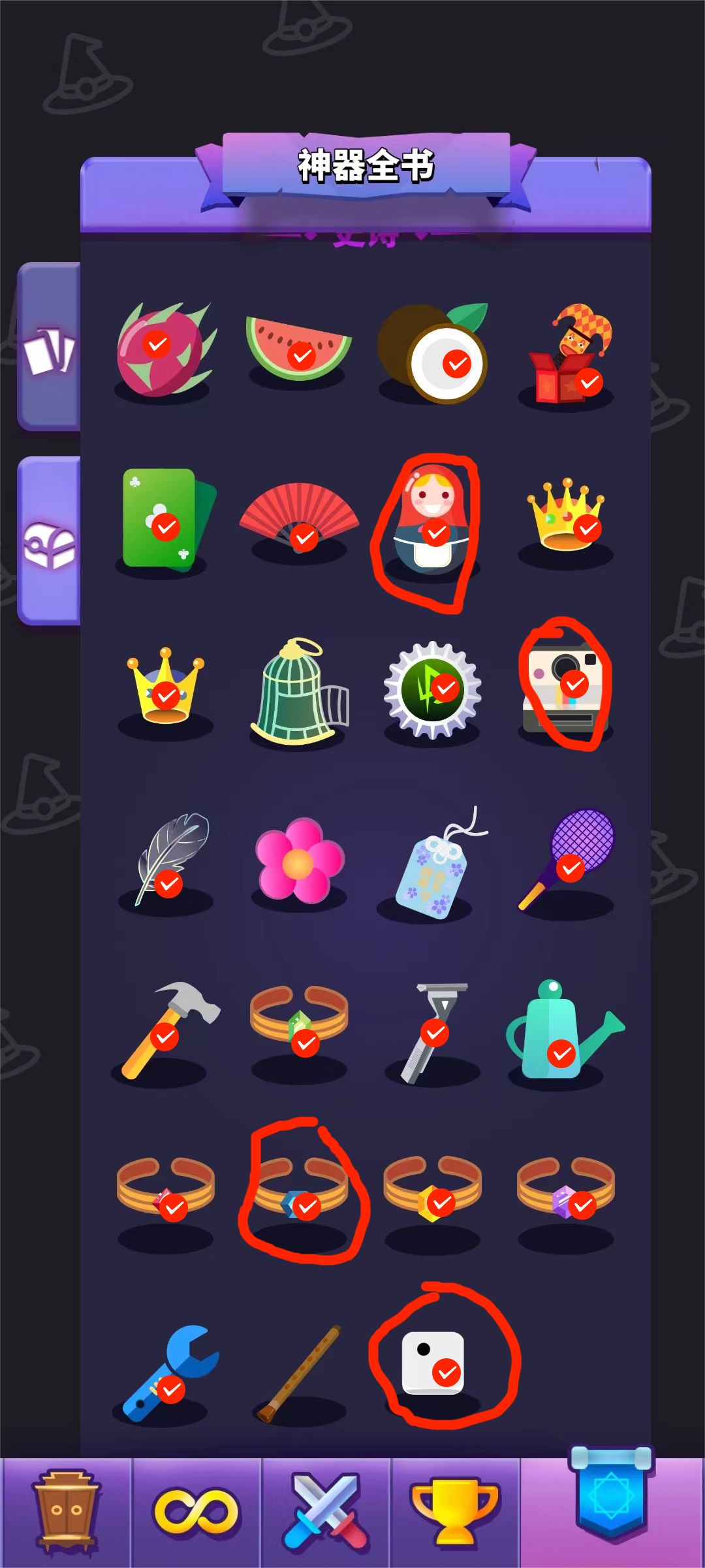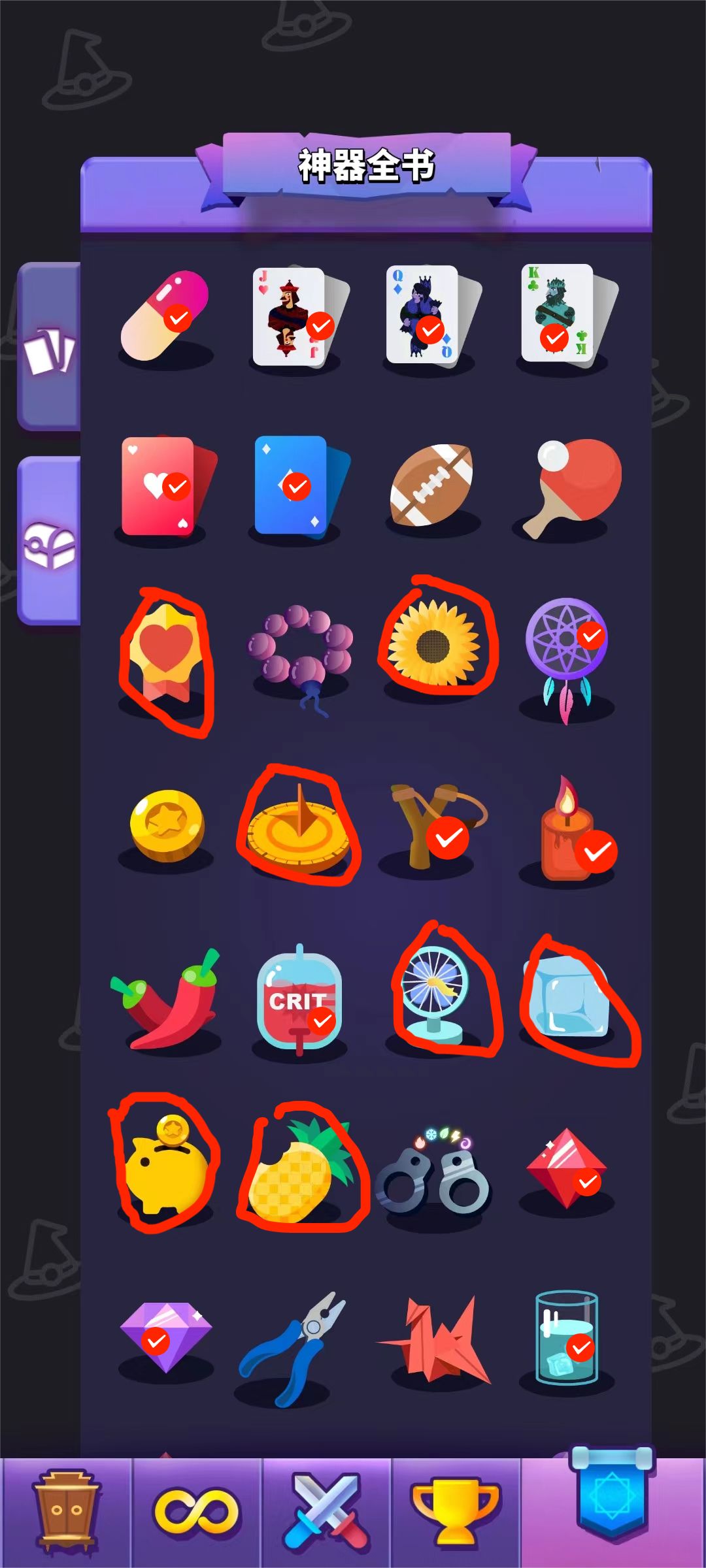 二、说一下神器的配置,我这局也有个别神器没拿到,所以我就说下我这个思路理论上需要那些神器,下面图片具体表标识了。所有打红色√的都是对我们有用的,用圈圈画起来的都是非常重要必须的(我理想中完美配置下),具体如下(重点):