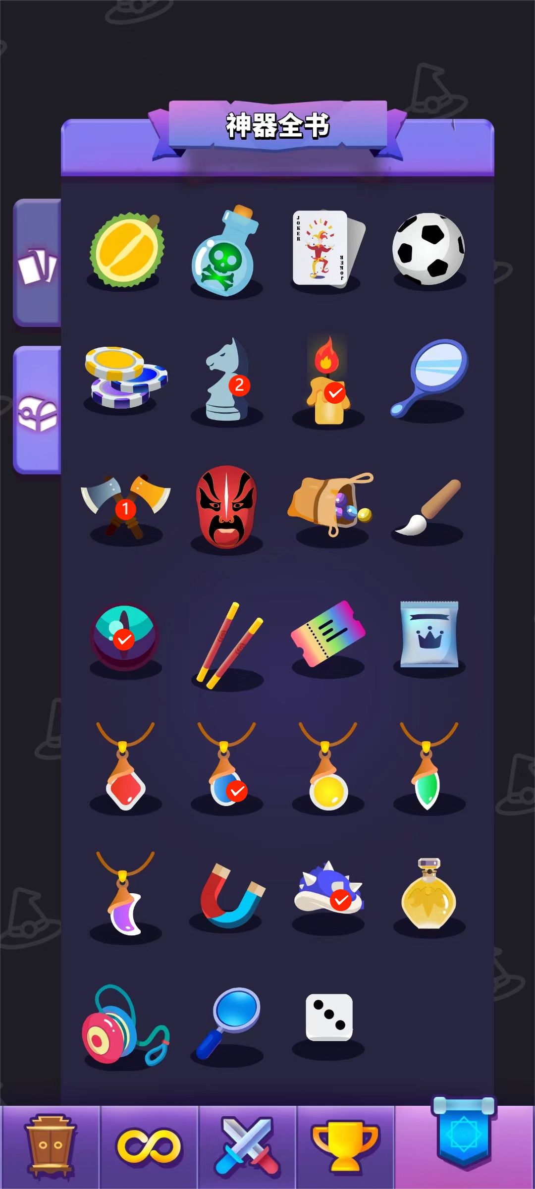 2、稀有神器:菠萝(裂甲必须)、向日葵(击杀精英怪加钱,必须)、日晷(减符文cd,必须),红心勋章(boss前回血,治疗必须)、火焰、寒冰、雷鸣、暗影戒指(加各元素法术伤害必须)、运动耳机、芦苇(回复护甲必须)、1的骰子(关乎法术能不能都升到满级,必须),小猪储钱罐(符文存钱,必须)、冰块(符文不消失,配合存钱必须)、小风扇(生命越低miss越高,大后期重要,最好有)其他的就作用一般随便了,没得选才拿其他的。