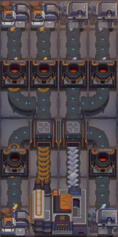 )这个游戏,配方和速度是不匹配的,例如铁矿生产铁片、铜矿生产铜线,同级别情况下矿井和冶炼车间比例2:1多了、1:1少了,总达不到效率极限,因此只要保证不在进料和出料上浪费格子、严重堵料效率也不会低。正好用来做模块化设计,布成完整的矩形,实现美观、高效,产出直观清晰、层次分明,模块复用高,移动方便等。