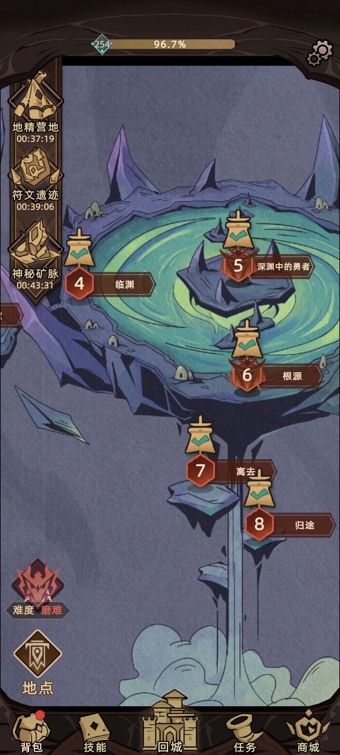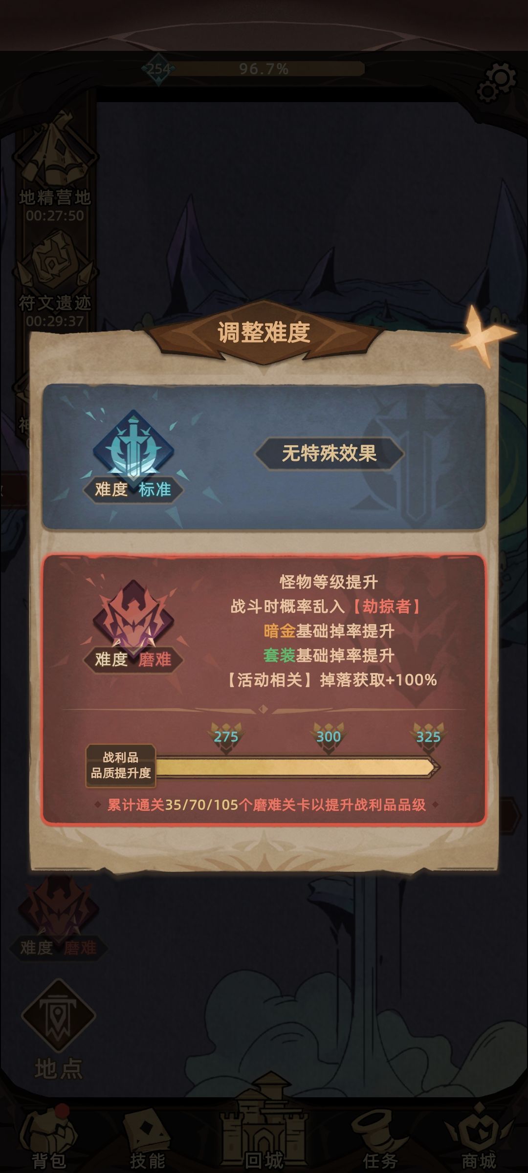 频遭磨难后,感觉进行不下去,无法愉快的玩耍了!可又很喜欢这款游戏,耐玩不逼氪且有暗黑精髓,刷装备的手游很少有这么棒的了!那就做功课吧!看论坛里诸位大佬的精华攻略收获良多!我是这么做的,先提升幸运值后(小绿叶看广告),在标准难度地图里先刷点有针对性的金色装备,再简单强化洗炼一下,没想到效果不错,居然打穿磨难了,就意外,就开心!