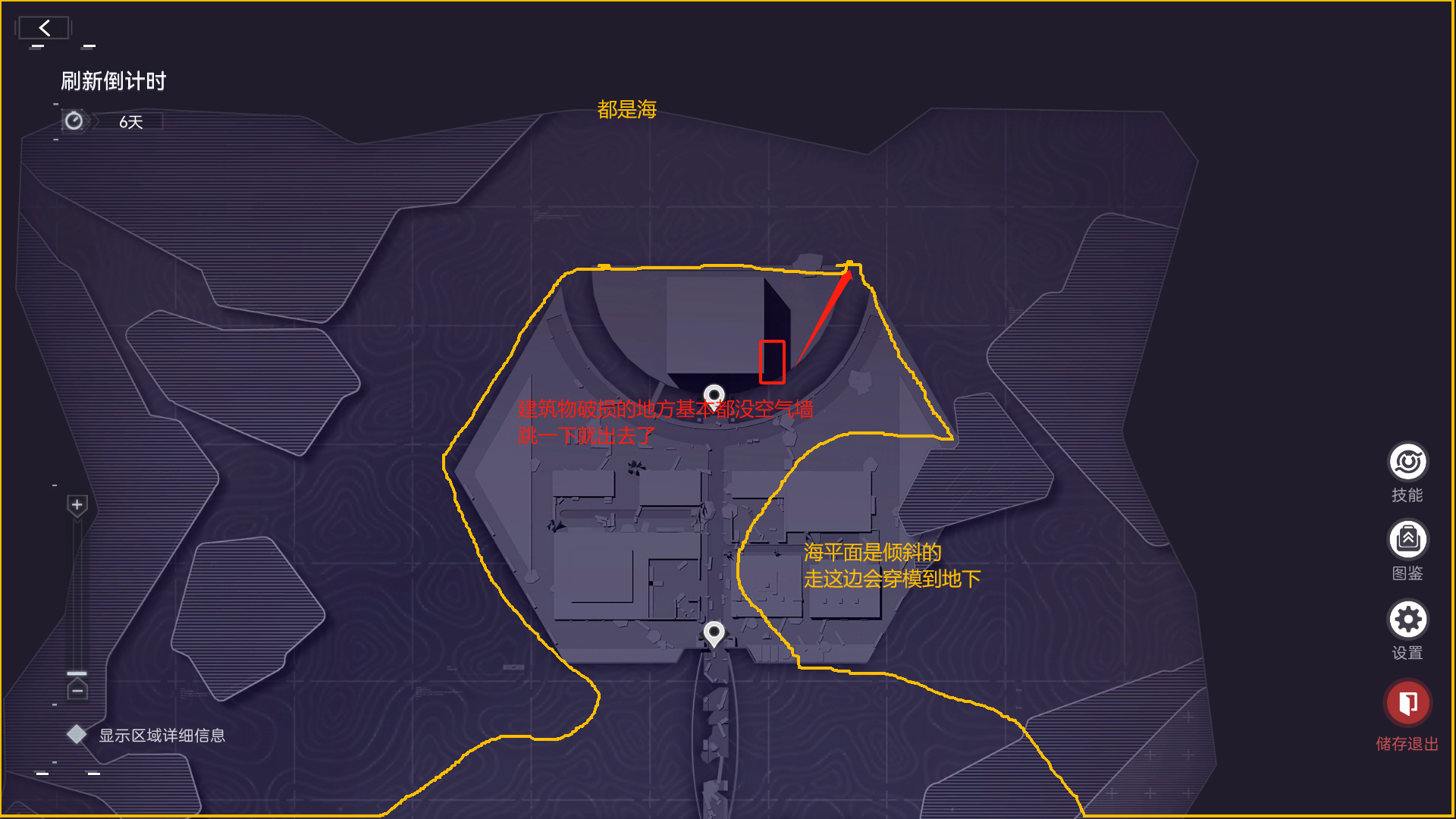 图1那个点出去没啥意义,看过去全是海也不能往下走会走到即死区域,直接刷新回卡出地图的地方。