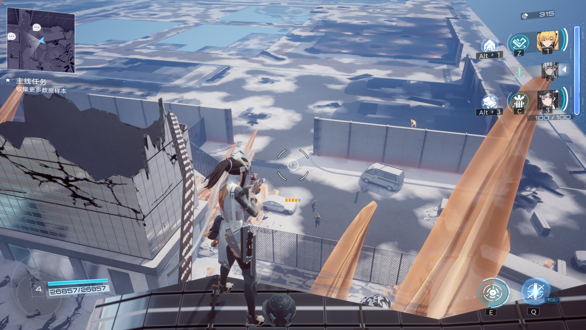 这个点应该是比较难想到的一个点,正常应该是上栏杆后冲刺跳跃,我比较蠢没想到,所以直接用技能了,黄金狮子的E,绷带小姐的E,四手的支援技都可以过去,只要有加速或者大位移的都可以,琴诺支援技除外,虽然速度很快但是期间不能跳跃。