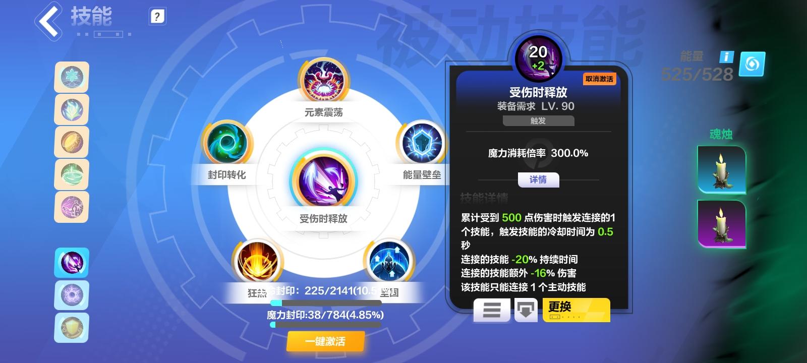 那么带了这个词条,意味着魔盒的第四技能栏(也就是上图的夺目)直接全程触发,同时受伤释放也全程触发。