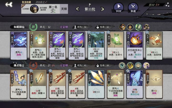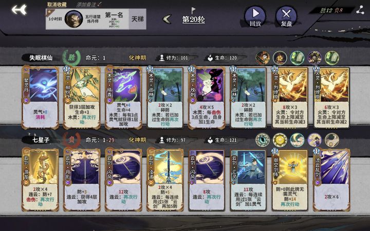 前期用土金卡牌过渡,中期可用火土卡牌过度。前2轮多换牌,胜利可多加两张次换牌机会,第3轮后每轮可换牌一次,元婴时要把换牌次数全用掉再上化神!!!