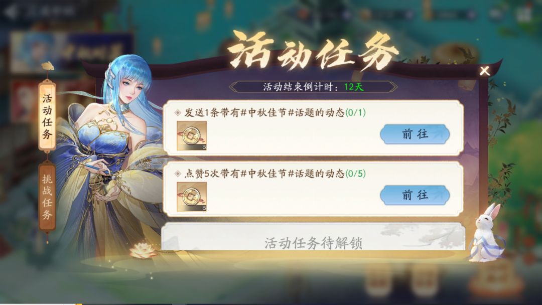 『活动任务』会随活动天数逐渐解锁,已解锁的任务可在活动开启期间任意时间完成;『挑战任务』在活动首日就会全部解锁,完成后有头像框和2023中秋纪念道具等着大侠哦!