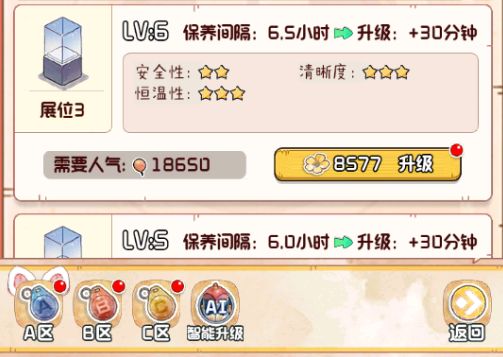 在展厅内的展柜界面,可以点击智能升级,即用花朵将所有展柜提升一个等级,若花朵不足则停止升级。