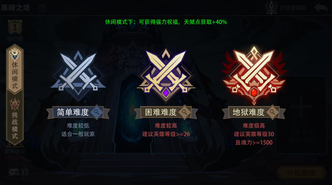 黑暗之塔新增“休闲模式”,原模式改为“挑战模式”,可在选择难度的时候进行切换。