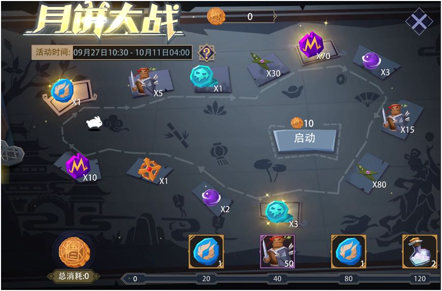 活动内容:活动期间,可消耗固定数量的“月饼”来启动游戏,获得随机奖励。每日无次数限制。 累计消耗“月饼”数量达到一定阶段时,还能领取“魂石”、“幻彩之尘”等额外奖励。