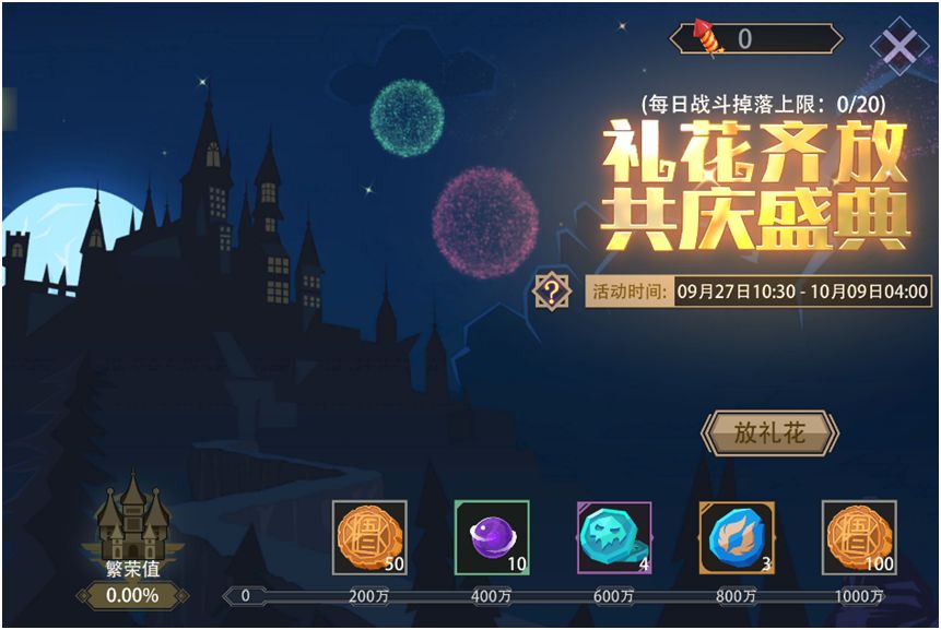 活动内容:活动期间,在[冒险模式/梦魇模式/冒险试炼场]下击败“首领”必定会掉落随机数量的“礼花炮”。消耗“礼花炮”能获得魔晶奖励并随机增加全服繁荣值。当累计繁荣值达到一定阶段时,全服玩家还能获得“月饼”、“魂石”等额外奖励。