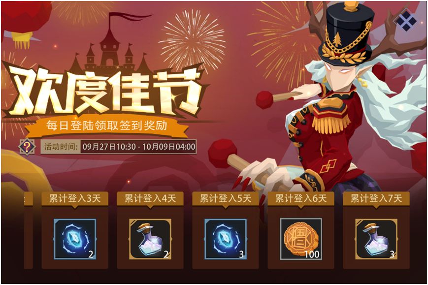 活动内容:双节同庆,幸福满满。活动期间,每日登录游戏即可免费领取 “月饼”、“英魂”、“幻彩之尘”等。
