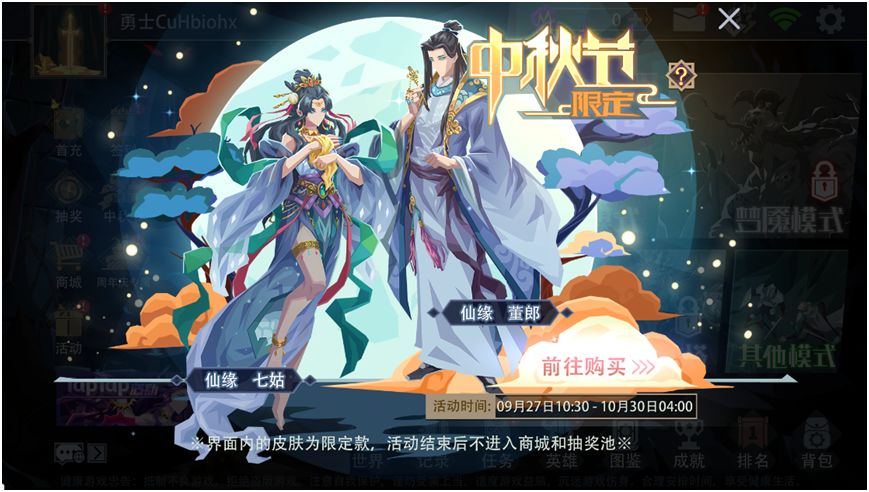 活动内容:神话人物[七姑]与[董郎]化身中秋大使,甜蜜来袭!活动期间,中秋节限定皮肤[仙缘 七姑](雪月妖狐专属)与[仙缘 董郎](灵术巫师专属)限时开启售卖;可通过主界面的特定界面进行购买。