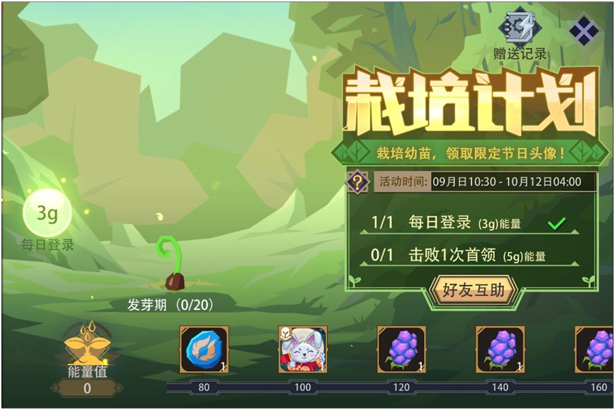 活动内容:通过每日登录、每日击败1次首领、每日好友互助等方式可激活能量。点击“能量图标”可收获能量。植物会根据获取的能量进行成长;达到对应能量值可获得“英魂”、“限定头像”等阶段性奖励。植物首次“成熟”后,会进行二次生长;你还可额外获得后续的阶段性成长奖励。
