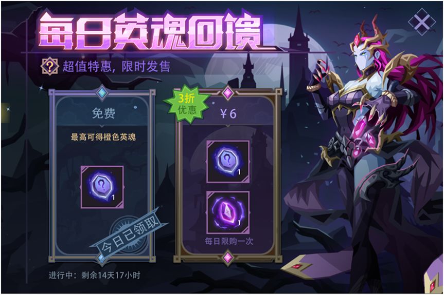 活动内容:活动期间,免费礼包每日可领取一次,可随机英魂(可开出白~橙档次的英魂);次日04:00刷新。活动期间,6元礼包每日限购一次,可获得史诗英魂和随机英魂。