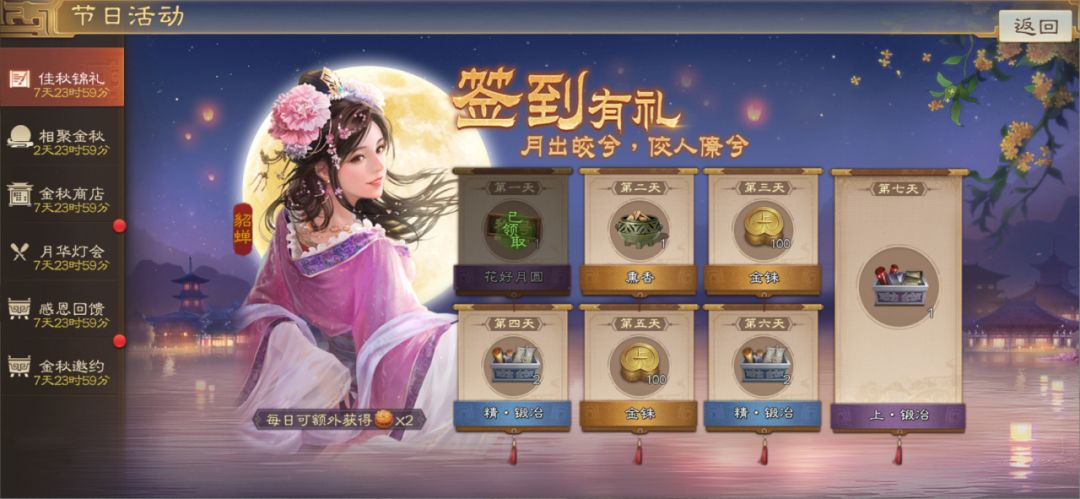 活动奖励:每日签到即可领取限时称号、熏香、金铢、锻造材料,还有节日道具月饼