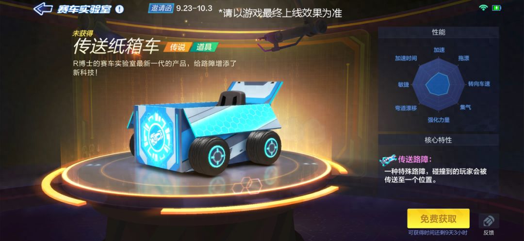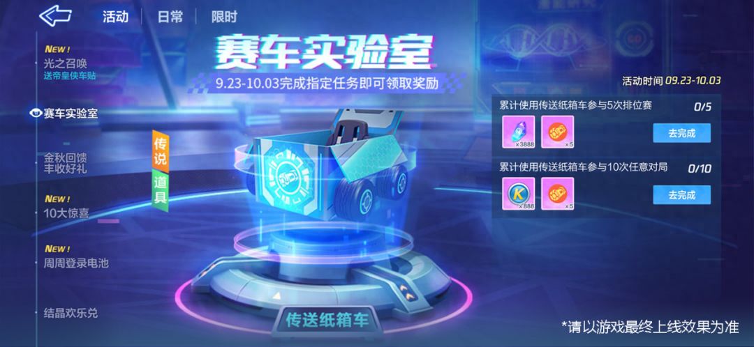 目标已到达指定位置,准备开启随机传送!9月23日起,新一期赛车实验室开启,传送纸箱车惊喜来袭!