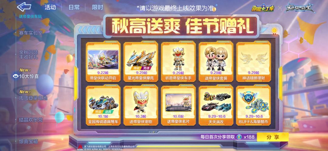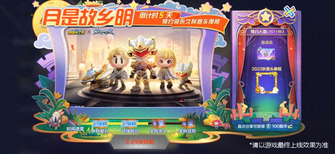 秋高送爽,佳节来到!金秋时刻,十大惊喜陆续上线!联动好礼连连看,海量酷币、天天满改传说车,更有全新传说道具弩车全民送!敬请期待吧!