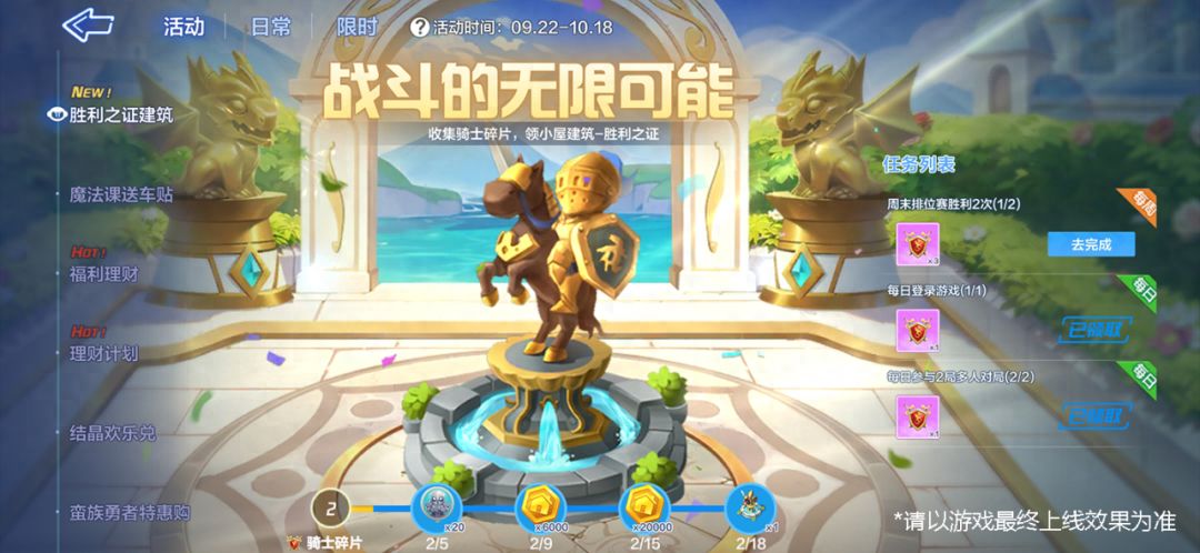 金甲骑士牵引战马扬蹄向前,胜利的呼声传到了王城之中!9月22日起,【胜利之证建筑】活动开启,完成活动任务收集骑士碎片,领取全新小屋建筑【胜利之证】!