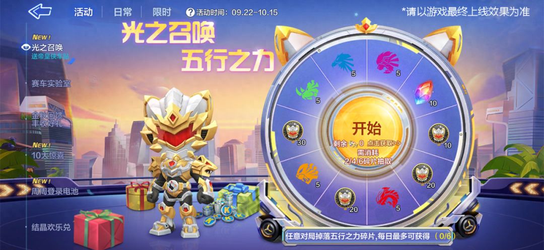 闪耀的五行之力集结,帝皇铠甲!合体!9月22日起,帝皇侠主题站率先开启,联动主题七大活动乐享不停!完成联动系列活动,积攒光影石,累计指定数量即可领取联动限定称号、头像框、车牌等精美好礼!