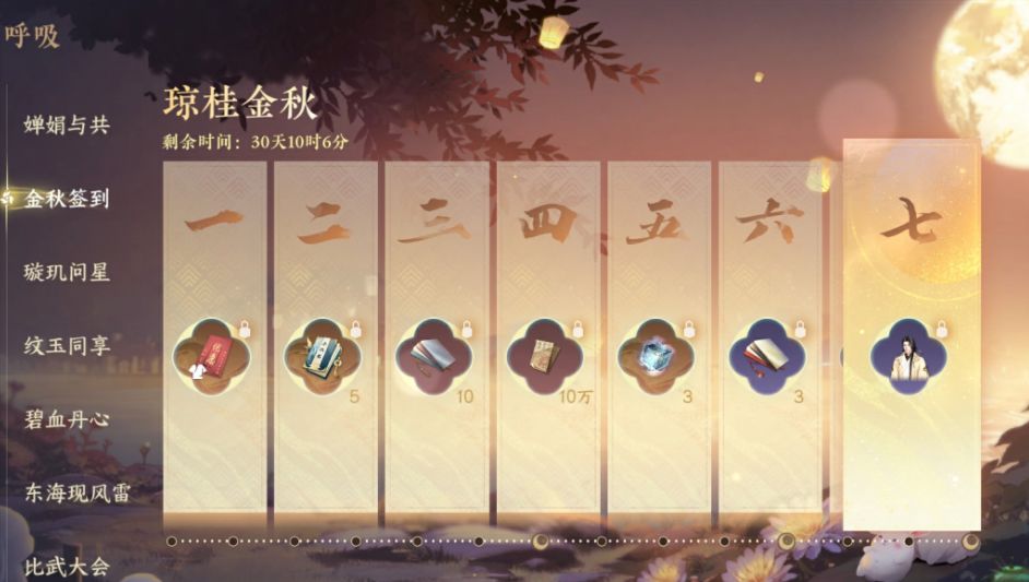 4)琼桂金秋签到活动:前七天的奖励是:半价券、5个寻侠帖、10个轻容染,10万交子、3个稀有内功自选、3个玉华染,时装【瑞鹤云阳】等等。活动将持续五周,但总共只用签到14天;平均下去一周只需要上线签到3天就可以。
