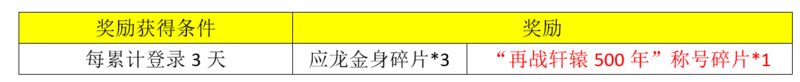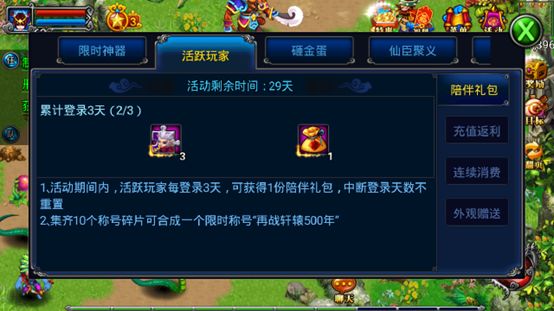 活动期间内,活跃玩家每登录3天,可获得1份陪伴礼包,中断登录天数不重置;