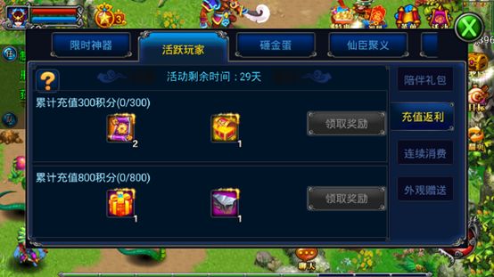 活动期间内,活跃玩家充值可获得积分,累计积分达到一定条件可领取丰富奖励,每种奖励仅限领取1次;