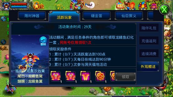 活动期间内,活跃玩家连续每日消费满1000元宝达到指定天数,可获得丰富奖励;