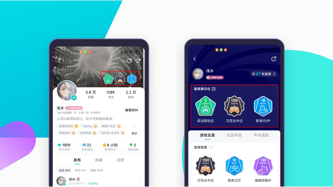 2. 同时为了后期能增加更多徽章,新徽章系统更新了主页的排版及徽章分类。小声地说:对于接入TapTap成就的游戏,我们正在设计相关的游戏徽章,例如 Tapper 所获的白金成就也会变成可佩戴的徽章哦!