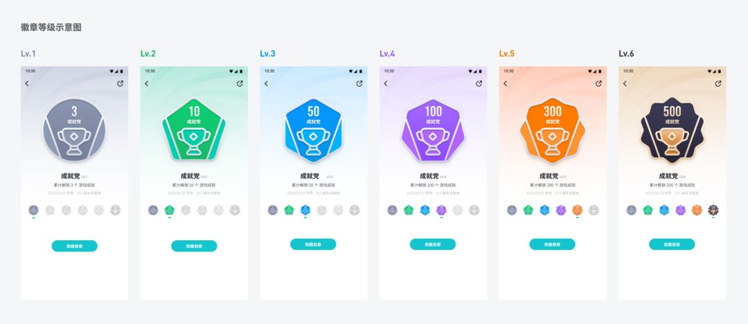 1. 为了强化徽章获得的成就感和佩戴体验,我们借鉴了装备升级的概念,将徽章分为6个等级,并为每个等级定制了专属造型和品阶色。(徽章等级示意如下图所示)