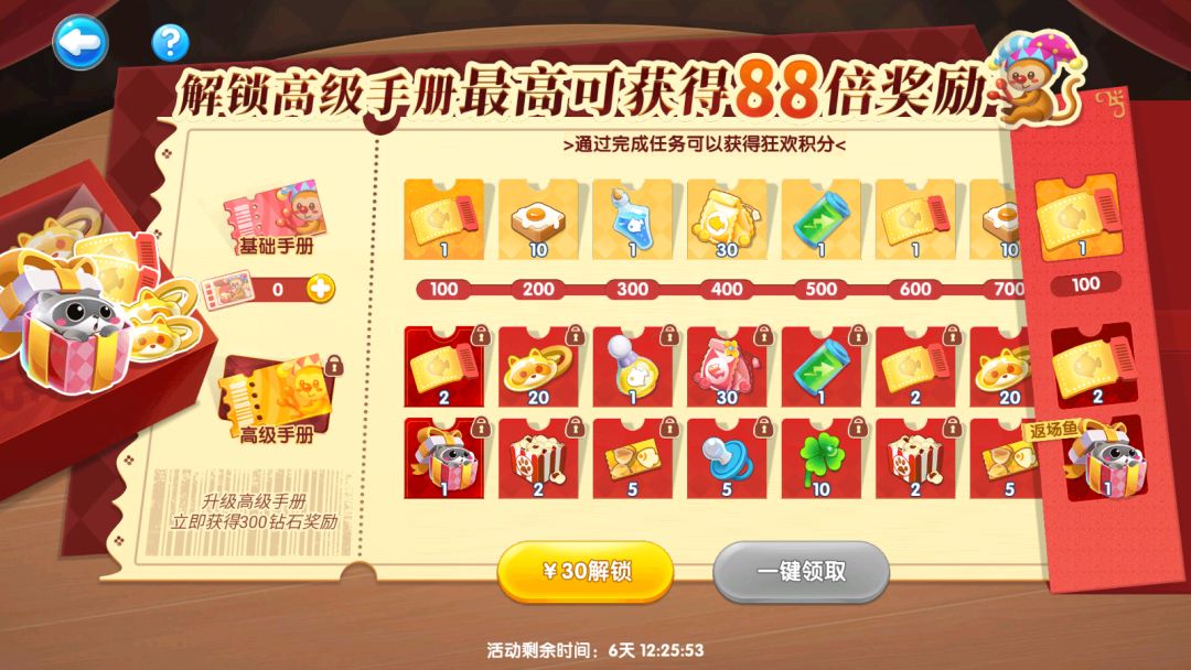 ①收集一定数量狂欢积分可在基础手册内领取疯狂马戏团活动道具,收集越多奖励越多~