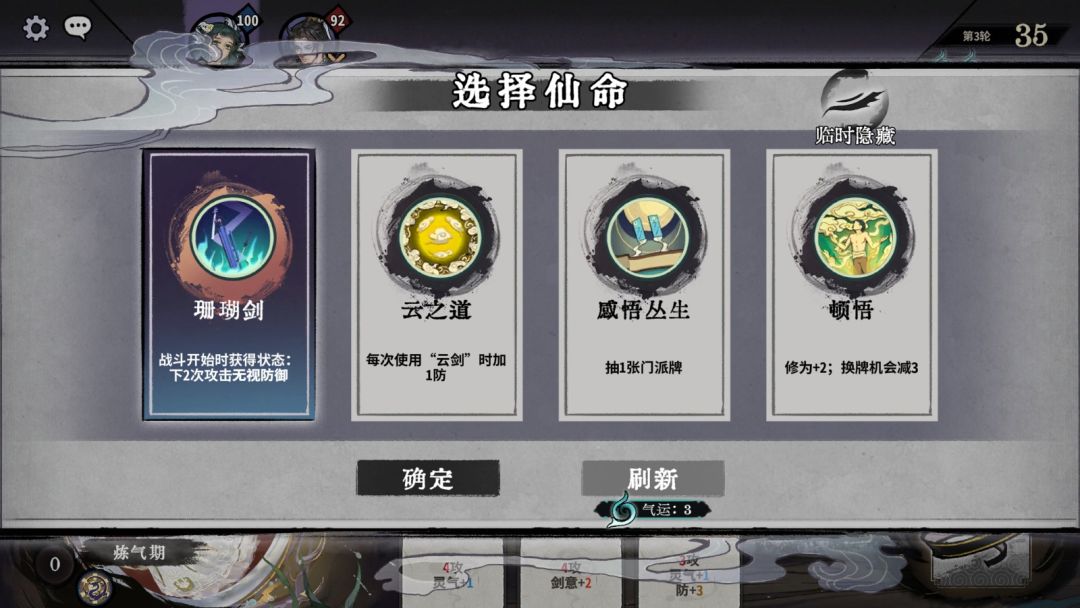 3. 换牌机会为0时,可耗1气运换牌(当前境界或低一个境界的牌出现率增加)。