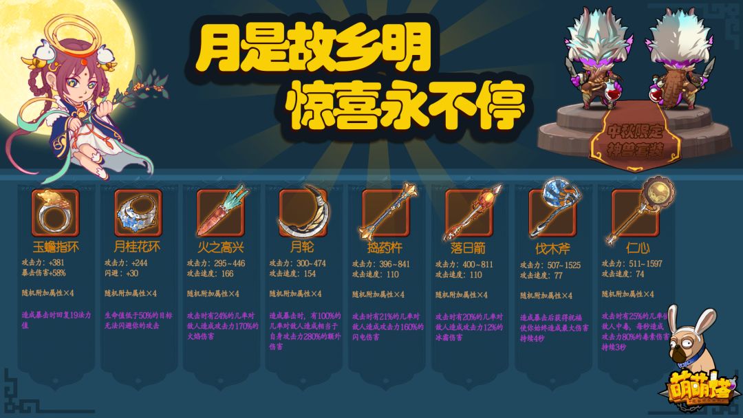 ④商城中将上架本次限时中秋副本专属装备,喜欢就赶紧带走它吧~(各装备参数图将在tap论坛或官群文件夹进行展示,各位小怪兽赶紧冲吧~)下图附上本次装备礼包介绍详情图,各位小怪兽请查收~