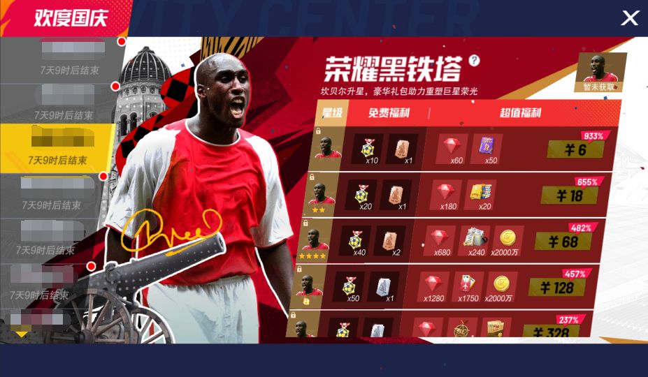 活动期间,登录游戏即可领取传奇球星坎贝尔,包含机票、欧元等超值奖励;花费30元还可解锁豪华奖励,海量菁英机票及养成素材,超值1466%!