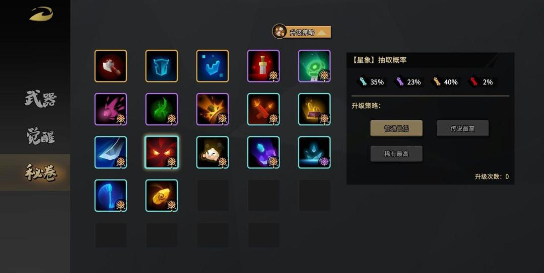 “稀有最高”,优先将普通秘卷提升至稀有品质,提高稀有品质秘卷占比以及稀有星象出现概率;