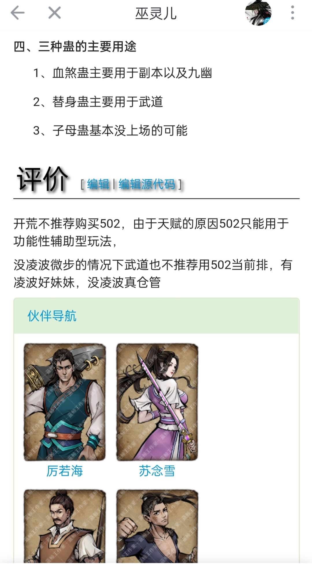 起因是这样,我看了一下wiki对巫灵儿的评价,其实评价没问题,但是容易让萌新对巫灵儿产生误解:巫灵儿PVE没大用,没凌波不要玩巫灵儿。