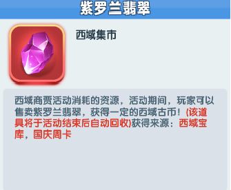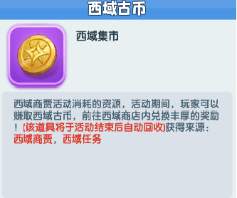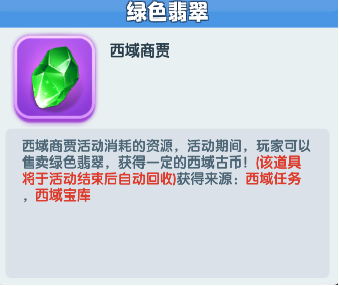 西域商贾:活动期间可在西域商贾内完成任务获得绿色翡翠,绿色翡翠在自己的市集或好友的市集出售可获得西域古币,西域古币可在商店兑换奖励。