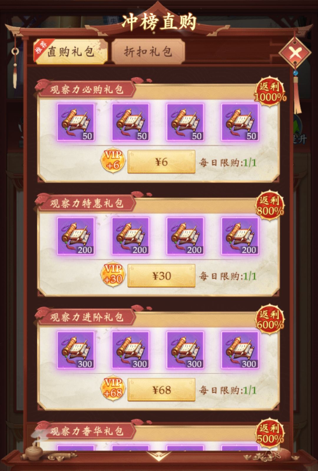 冲榜活动开启后,对应榜单下配置了对应的冲榜礼包;冲榜礼包分为直购与折扣,都可快速、大量地获得对应的冲榜道具,助力神探大人勇夺榜首!