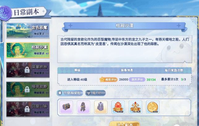 这些副本是常驻的,分为日常副本和团队副本。不过各自都有次数限制,日常每天可刷三次,团队一个星期就只有三次。日常副本,各个等级可以刷的副本也不一样。等级越高,刷的副本等级越高,奖励也更多。不过光等级够也不行,战力也得拉上去,不然还打不动副本怪,那样就极其折磨了。团队副本其实跟日常差不多,只是多了个人数限制罢了。刷这个副本就需要和别人一起组队进副本悬赏任务
