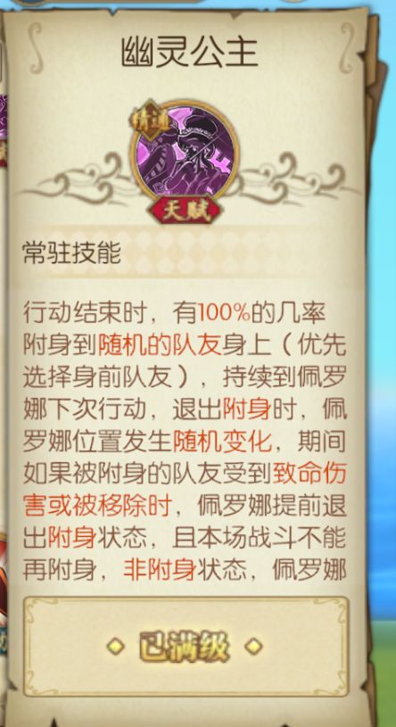 行动结束时,有100%的几率附身到随机的队友身上(优先选择身前队友),持续到佩罗娜下次行动,退出附身时,佩罗娜位置发生随机变化,期间如果被附身的队友受到致命伤害或被移除时,佩罗娜提前退出附身状态并且本场战斗不能再附身,非附身状态,佩罗娜速度提升10%,附身状态,附身目标速度提升10%