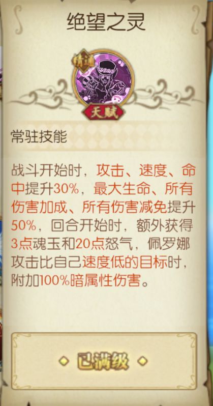 战斗开始时,攻击、速度、命中提升30%,最大生命、所有伤害加成、所有伤害减免提升50%,回合开始时,额外获得3点魂玉和20点怒气,佩罗娜攻击比自己速度低的目标时,附加100%暗属性伤害。