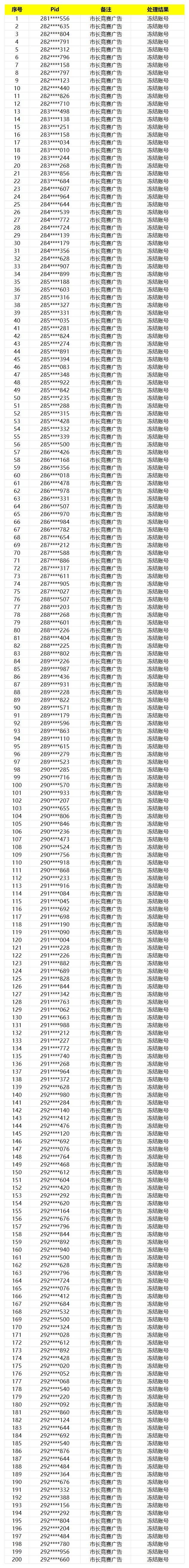 本次行动针对部分渠道账号进行核实,从严查处市长竞赛广告作弊,市政工已收集了相关违规账号信息,并对这些玩家进行了账号冻结处理,将于此公告中予以公示。